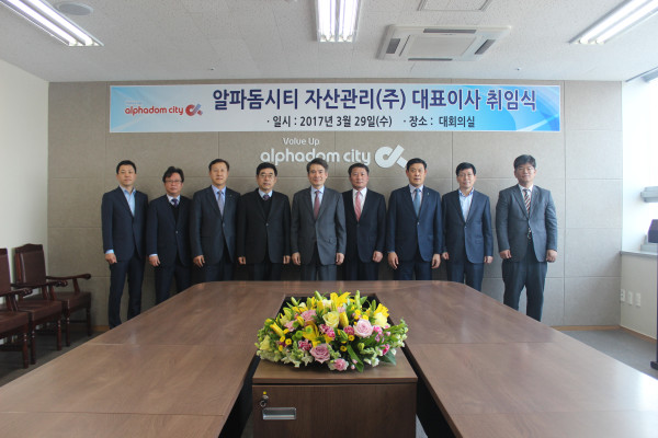 경기 성남시 분당구 백현동 소재 알파돔시티 자산관리는 29일 자사 대회의실에서 대표이사 취임식을 개최했다. 이날 박수홍 전 LH도시환경본부장(가운데)이 대표이사로 취임했다.(사진제공=알파돔시티)
