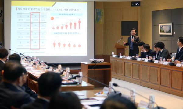 지난 28일 서울 강남구청에서 관광업계 관계자들로부터 중국 관광 금지령에 따른 피해상황 및 건의사항을 듣는 ‘관광업계 관계자 간담회’를 개최했다. 사진은 한국여행업협회 관계자가 최근 중국 시장 현황에 대해 설명하고 있는 모습.(사진제공=강남구청)