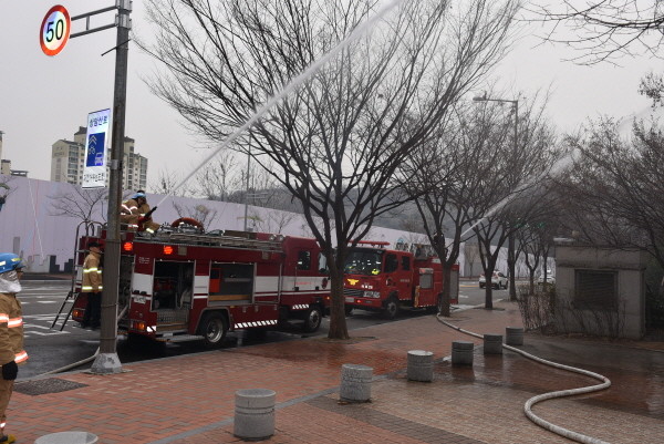 서울 마포소방서 소방공무원들은 지난 28일 오후 상암동 소재 박정희 기념관에서 소방용수가 부족한 상황에서 체계적인 중계 송수로 신속한 화재를 진압하기 위한 중계방수 훈련을 실시했다.(사진제공=마포소방서)