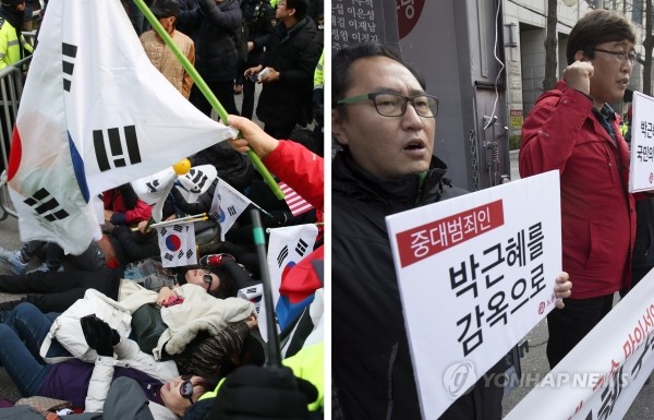 | ▲ (좌) 박근혜 전 대통령 영장실질심사가 예정된 30일 오전 서울 강남구 삼성동 박 전 대통령 자택 앞에서 지지자들이 길바닥에 드러누워 있다. (우) 박근혜 전 대통령의 피의자심문이 열린 30일 오전 서울 서초구 법원삼거리 앞에서 노동당의 박 전 대통령 구속 촉구 집회가 열리고 있다.(사진제공=연합뉴스) | ||