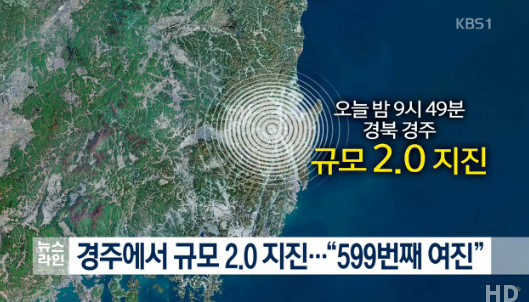 이어 7분 뒤인 오후 1시 53분경 경북 경주시 남남서쪽 6km 지역에서 규모 2.5의 지진이 또 다시 일어났다.