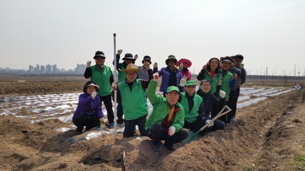 경기 수원시 팔달구 고등동 새마을지도자협의회는 지난 29일 권선구 금곡동에 소재한 텃밭(700㎡)에 지역내 소외계층 및 어려운 이웃을 후원하기 위한 감자심기 행사를 가졌다. 사진은 행사에 참여한 협의회 관계자들이 파이팅을 외치는 모습.(사진제공=팔달구청)