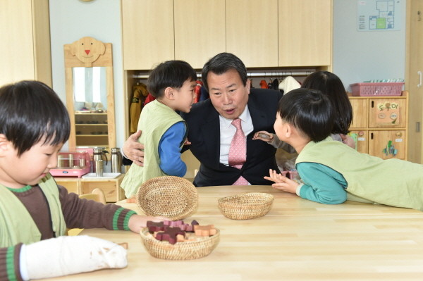 나진구 중랑구청장이 지난 30일 오후 2시 중랑구 최초로 민간자본이 투입된 국공립어린이집인 ‘햇살아래 보듬이나눔이 어린이집’ 개원식에 참석한 후 어린이들과 대화를 나누고 있다.(사진제공=중랑구청)