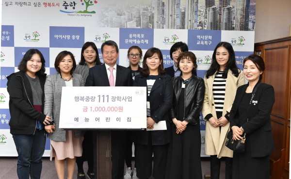 나진구 중랑구청장이 지난 31일 오전 11시 구청장실에서 ‘예능어린이집’ 관계자들에게 ‘행복중랑 111 장학사업’ 기탁금 100만원을 전달받고 기념 촬영을 하고 있다.(사진제공=중랑구청)