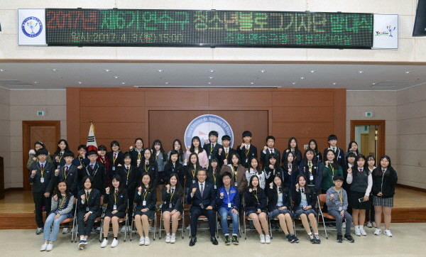 인천 연수구는 지난 3일 구청 대회의실에서 ‘제6기 연수구 청소년 블로그 기자단 발대식’을 개최했다. 사진은 이재호 구청장(앞줄 가운데) 및 학생들이 기념촬영을 하는 모습.(사진제공=연수구청)