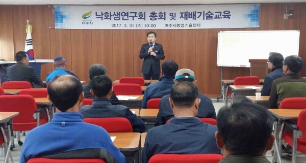 최근 여주시농업기술센터 세미나실에서 집중 육성하고 있는 시 낙화생연구회가 총회를 열고 ‘토양관리와 땅콩재배기술’이라는 주제로 재배기술교육을 실시했다. 사진은 교육에 참석한 관계자들이 강의를 듣고 있는 모습.(사진제공=여주시청)