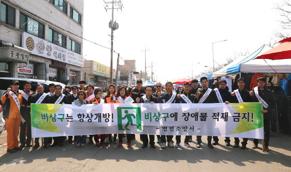 경기 연천소방서는 지난 4일 오전 전곡읍 5일장터에서 군청직원과 소방공무원, 전곡·연천 여성의용소방대원 등 50여명이 참여한 가운데 안전점검의 날을 맞아 화재예방 캠페인을 실시했다. 사진은 캠페인 종료 후 기념촬영을 하는 모습.(사진제공=연천소방서)