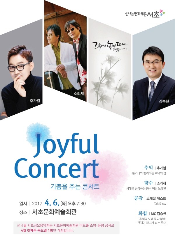 5일 구에 따르면 이번 콘서트는 서초금요음악회의 일환으로 총 5회 진행되는 것으로 MC 김승현씨, 통기타 가수 추가열씨와 소리새가 출연해 ‘그 속에서 놀던 때가 그립습니다’를 주제로 감미로운 통기타 연주와 추억의 팝송을 들려주며, 시대를 공감하는 향수 어린 노랫말로 관객과 하나되는 무대로 진행된다.