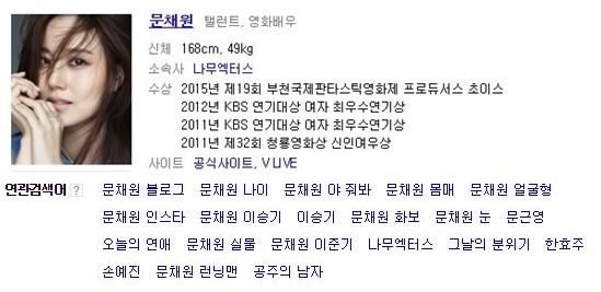 이와 함께 문채원의 연관검색어가 온라인상에서 화제를 모으고 있다. '문채원 블로그' 이외에도 문채원의 연관검색어로 나이, 몸매, 얼굴형, 화보, 눈, 이승기, 문근영, 손예진, '야 줘봐', 예능프로그램 '런닝맨', 출연작인 영화 '오늘의 연애', '그날의 분위기' 등이 있다.