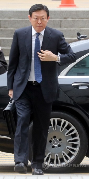 경영비리 혐의로 재판에 넘겨진 신동빈 롯데그룹 회장이 5일 오전 서울중앙지법에서 열린 3회 공판에 출석하고 있다.