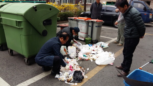 경기 수원시 영통구는 생활쓰레기 감량정책의 일환으로 오는 10월까지 주 2회 이상 지역내 126개 공동주택단지를 대상으로 종량제 쓰레기봉투 성상분석을 실시할 예정이다. 사진은 지난 5일 관계자들이 분석을 진행 중인 모습.(사진제공=영통구청)