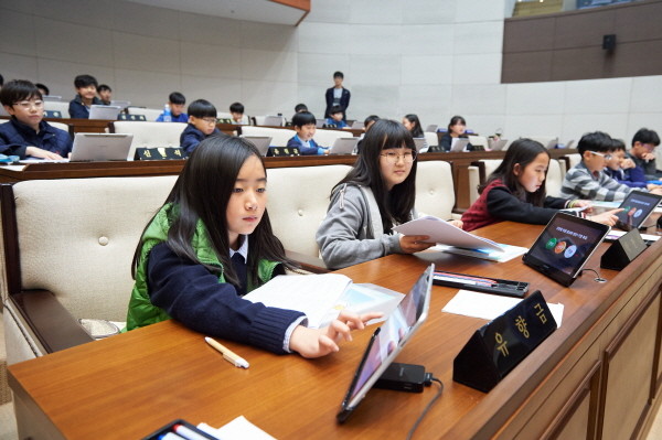 | ▲ 사진설명=용인시의회 청소년 지방자치교육 프로그램에 참여한 동천초등학교 학생들이 모의의회 체험 중 본회의 안건에 대해 기명전자투표를 하고 있는 모습이다. | ||