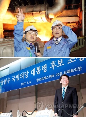 더불어민주당 문재인 대선후보(오른쪽)가 6일 오전 전남 광양시 포스코 광양제철소 용광로 앞에서 제철소 관계자로부터 설명을 듣고 있다(위). 국민의당 안철수 대선후보가 6일 오전 서울 태평로 한국프레스센터에서 열린 관훈클럽 초청 토론회에 참석해 자리로 향하고 있다.