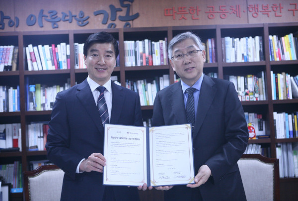 이해식 서울 강동구청장(왼쪽)은 지난 6일 구청장 집무실에서 한방 난임치료비 지원 사업을 적극 추진하기 위해 강동경희대병원과 업무협약을 체결했다. 사진은 이 구청장과 김기택 강동경희대병원장이 기념촬영을 하는 모습.(사진제공=강동구청)