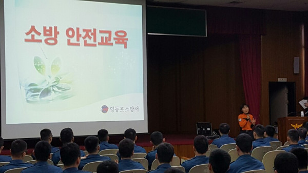 최근 서울 영등포소방서는 당산동 소재 영등포경찰서 경찰관 및 의경들을 대상으로 소방안전교육을 실시했다. 사진은 소방서 관계자가 소화기 사용법, 심폐소생술 등에 대해 강의를 진행하는 모습.(사진제공=영등포소방서)