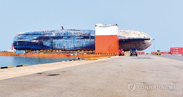 세월호가 9일 오후 목포신항에서 본격적인 육상작업을 위해 반잠수선 위에서 600대의 모듈트랜스포터 위에 실린 채 부두쪽으로 이동하고 있다.