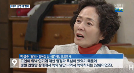 김영애는 지난 9일 오전 가족들이 지켜보는 앞에서 “쓰러질 때까지 끝까지 최선을 다하는 게 연기자의 자세”라는 말을 남겨둔 채 세상을 떠났다.
