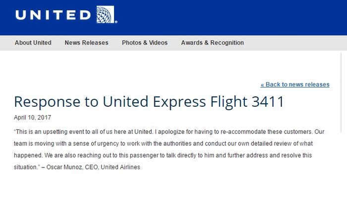 유니아티드 항공 측은 홈페이지에 사과 성명서를 냈다. 그러나 성명서에는 오버부킹 된 상황에 대한 사과만 있을 뿐 승객에 대한 비인도적 처사에 대한 언급은 없어 오히려 논란은 더욱 커지고 있는 상황이다.