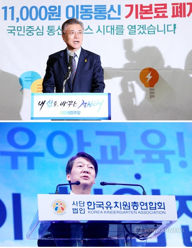 더불어민주당 문재인 대선후보가 11일 오전 경남 창원시 창원컨벤션센터에서 ‘내 삶을 바꾸는 정권교체’ 정책시리즈 4탄으로 ‘가계통신비 부담 절감 8대 정책’을 발표하고 있다(위). 국민의당 안철수 대선후보가 11일 오후 서울 송파구 올림픽공원 SK핸드볼경기장에서 열린 한국유치원 총연합회 사립유치원 교육자대회에 참석해 발언하고 있다.