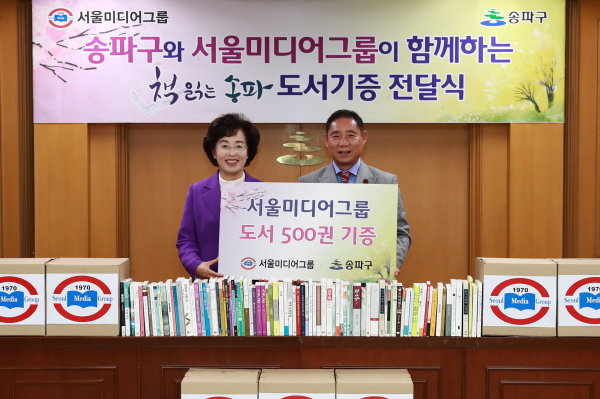 지난 10일 서울 송파구가 서울미디어그룹으로부터 어린이·청소년도서와 인문도서 등의 도서 500권을 기증받았다. 사진은 도서기증을 받은 후 박춘희 구청장(왼쪽)이 방재홍 회장과 함께 기념촬영을 하고 있는 모습.(사진제공=송파구청)