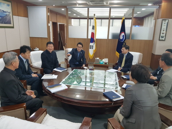 김선교 경기 양평군수(가운데)가 지난 11일 오전 한강유역환경청을 방문, 나정균 청장을 비롯한 유역청 관계자를 만나 한강수계기금을 활용한 사업 지원과 수변 구역 재조정 등 다양한 현안사항을 위한 적극적인 지원을 건의하고 있다.(사진제공=양평군청)