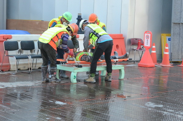 영등포소방서는 지난 11일 오후 서울제물포터널 2공구 현장에서 사고발생시를 대비해 민관 합동으로 훈련을 실시했다. 사진은 응급구조 훈련이 진행 중인 모습.(사진제공=영등포소방서)