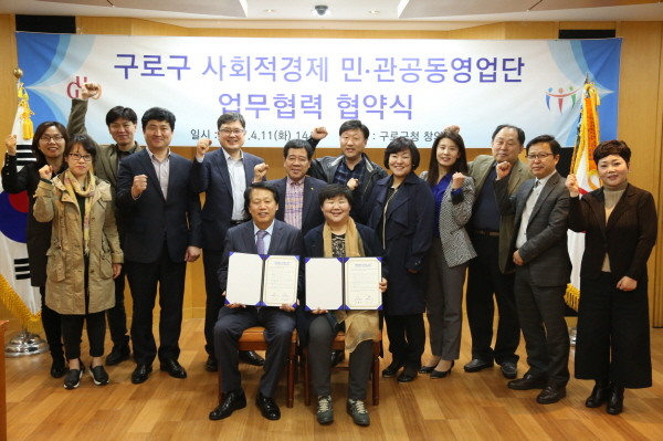 서울 구로구가 지난 11일 구청 창의관에서 구로사회적경제사회적협동조합과 지역사회 발전을 위한 상호협력을 위한 업무협약을 체결했다. 사진은 협약을 맺은 후 이성 구청장(앞줄 왼쪽)과 관계자들이 기념촬영을 하는 모습.(사진제공=구로구청)