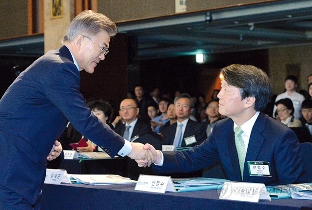 더불어민주당 문재인 대선 후보(왼쪽)와 국민의당 안철수 대선 후보가 12일 오전 서울 소공동 롯데호텔에서 ‘대한민국, 어떻게 바꿀 것인가!’란 주제로 열린 2017 한국포럼에 참석해 악수하고 있다.
