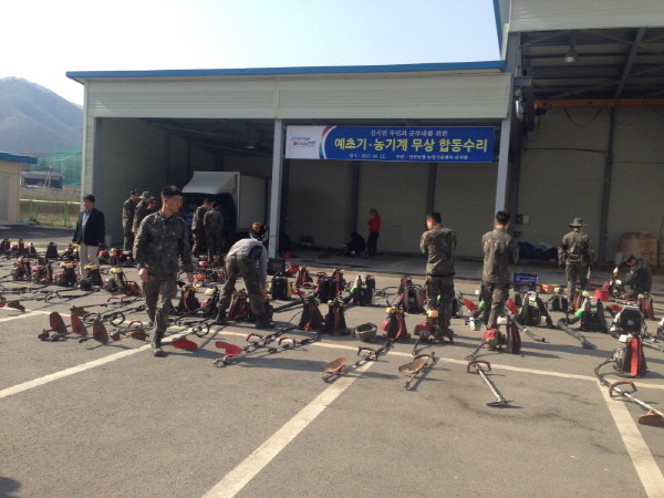 경기 연천군 신서면은 지난 12일 면과 연천농협과 농업기술센터 주관으로 지역내 군부대와 영농인들을 대상으로 ‘예초기 및 농기계 무상 합동수리’를 실시했다. 사진은 예초기 및 농기계에 대한 점검이 진행되고 있는 모습.(사진제공=연천군청)
