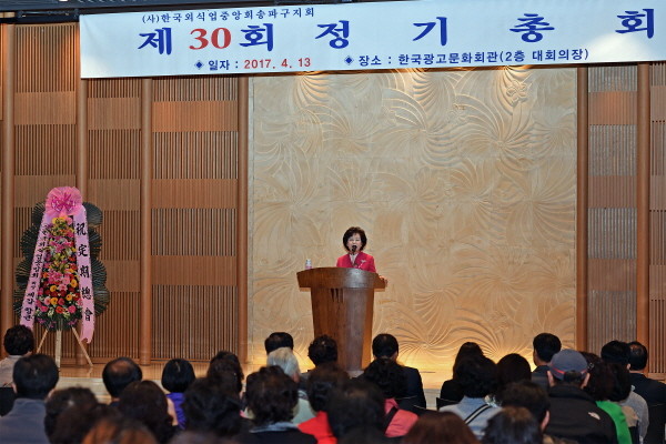 박춘희 서울 송파구청장이 지난 13일 한국광고문화회관에서 개최된 ‘한국외식업중앙회 송파구지회 정기총회’에 참석해 축사를 하고 있다. 30회를 맞은 정기총회에는 내빈 및 회원 등 280명이 참석해 2017년도 주요사업 보고와 토의를 진행했다.(사진제공=송파구청)