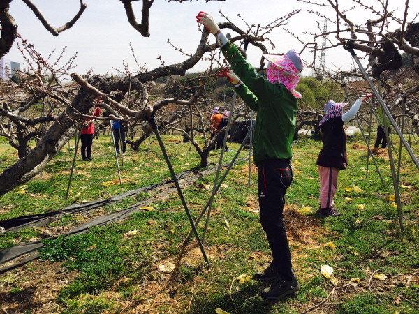최근 충남 아산시 배방읍이 봄철 농번기를 맞아 일손부족으로 어려움을 겪고 있는 농가를 위해 농촌 일손돕기를 실시했다. 사진은 배방읍장을 비롯한 직원들이 공수리에 위치한 이 모씨 농가를 방문해 복숭아 적화 작업을 진행 중인 모습.(사진제공=아산시청)