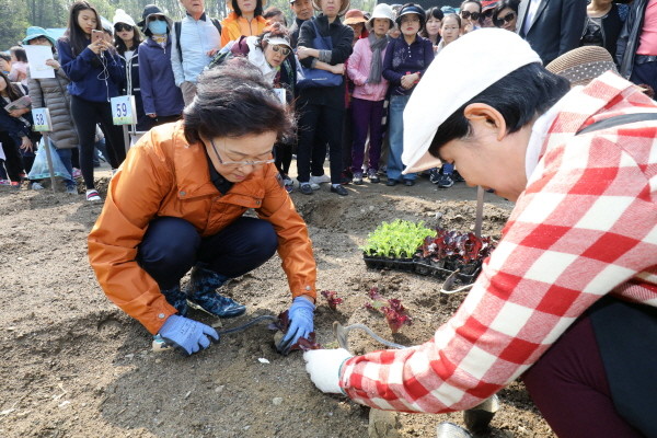 지난 15일 서울 강남구가 수서동 370번지 일대에 ‘친환경 도시 텃밭’을 개장했다. 사진은 텃밭 개장 행사에 참석한 신연희 구청장(왼쪽)이 상추 모종을 심고 있는 모습. (사진제공=강남구청)