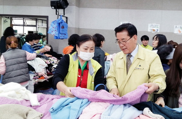 동대문구는 최근 장안종합사회복지관에서 ‘사랑나눔 알뜰바자회’를 개최했다. 사진은 행사에 참석한 유덕열 구청장(오른쪽)이 주민들과 바자회 물품을 살펴보는 모습.(사진제공=동대문구청)