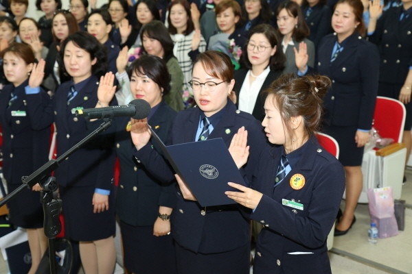 지난 14일 경기 용인서부경찰서는 경찰서 2층 강당에서 용인서부녹색어머니회 회장단과 용인교육지원청 교수학습국장, 지역내 41곳 초등학교장 등이 참석한 가운데 ‘2017 녹색어머니회 발대식’을 개최했다. 사진은 참여자들이 선서하는 모습.(사진제공=용인시청)