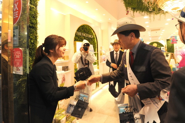 지난 17일 오전 중구 명동에서 열린 ‘관광 활성화를 위한 스마일 캠페인’에 참여한 최창식 중구청장(오른쪽)이 한 점포에 들러 안내문과 기념품을 나눠 주며 캠페인을 벌이고 있다.(사진제공=중구청)