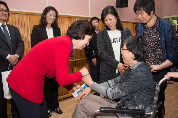 | ▲ 장애인종합복지관 개관 10주년 행사에 참석한 김수영 구청장(왼쪽)이 휠체어를 타고 있는 주민의 손을 잡고 이야기를 나누고 있다.(사진제공=양천구청) | ||