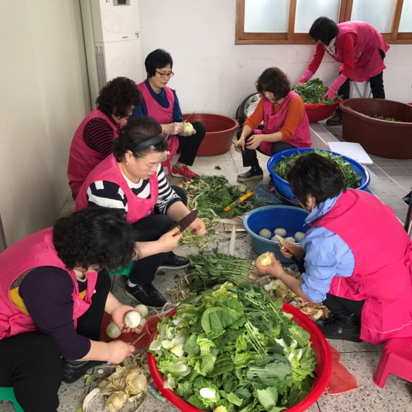경기 수원시 팔달구 여성자원봉사회는 18일 팔달 반찬나눔센터에서 ‘사랑의 반찬나눔’ 행사를 펼쳤다. 사진은 봉사회 관계자들이 열무김치를 만들고 있는 모습.(사진제공=팔달구청)