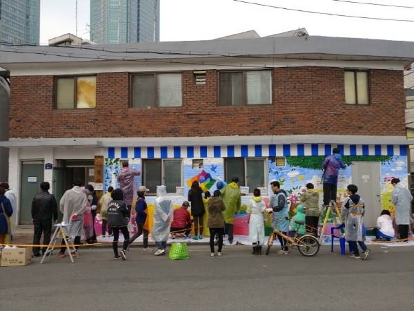 최근 서울 성동구건강가정지원센터 가족봉사단 ‘따뜻한 수레’는 뚝섬역에 있는 구립경마경로당에서 봉사단원 15가족 등이 참석한 가운데 벽화봉사를 진행했다. 사진은 벽화봉사 활동에 참여한 봉사단원들이 벽화를 그리고 있는 모습.(사진제공=성동구청)