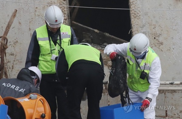 | ▲ 18일 오후 전남 목포신항만에 거치된 세월호 좌현 부분에서 관계자들이 수색을 한 뒤 가방으로 보이는 유류품을 정리하고 있다.(사진제공=연합뉴스) | ||