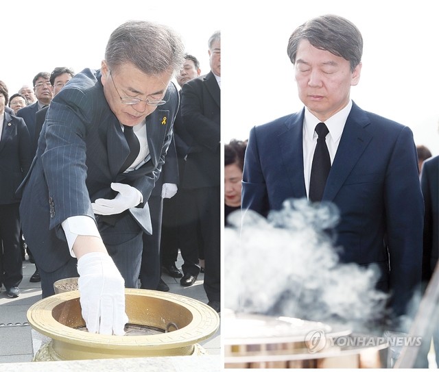 더불어민주당 문재인 대선후보가 18일 오전 제주시 봉개동 4.3평화공원을 찾아 4.3영령들에게 분향하고 있다(왼쪽). 국민의당 안철수 대선후보가 18일 오전 대전 유성구 국립대전현충원을 찾아 참배하고 있다.