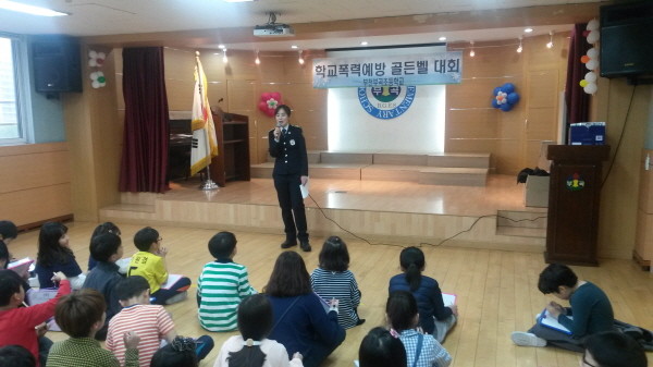 지난 18일 경기 부천부곡초등학교는 부천원미경찰서에서 주최하는 학교폭력 예방을 위한 '골든벨 퀴즈대회'를 실시했다. 사진은 경찰공무원이 학생들을 대상으로 대회를 진행하는 모습.(사진제공=부천교육지원청)