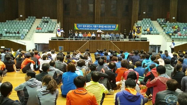 최근 경기 용인시 기흥구는 구 배드민턴 연합회 주최로 1박2일간 구 경찰대학 실내체육관에서 ‘2017 기흥구 춘계 한마음 배드민턴대회’를 개최했다. 사진은 정찬민 시장이 배드민턴대회장에서 축사를 하고 있는 모습. (사진제공=용인시청)