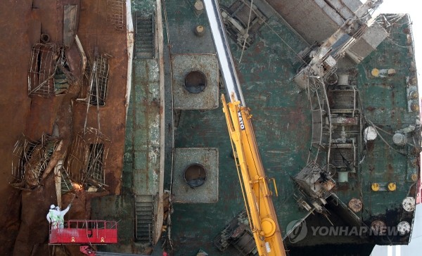 | ▲ 19일 오전 전남 목포신항만에 거치된 세월호에서 현장수습본부 관계자들이 수색 출입구를 위해 선미 부분 철제 구조물을 제거하고 있다.(사진제공=연합뉴스) | ||