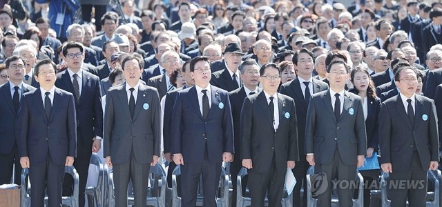 황교안 대통령 권한대행 국무총리(왼쪽부터)와 더불어민주당 우상호 원내대표, 자유한국당 정우택 원내대표, 국민의당 박지원 대표, 바른정당 주호영 원내대표, 정의당 노회찬 원내대표 등 참석자들이 19일 서울시 강북구 수유동 국립4.19민주묘지에서 열린 4.19혁명 기념식에서 애국가를 부르고 있다.