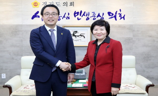 | ▲ 사진설명=지난 19일 경기도의회 의장 접견실에서 ‘경기도 청소년재단협의회’와의 간담회가 열렸다. 사진은 정기열 경기도의장(왼쪽)과 정미홍 경기도 청소년재단협의회 회장이 기념촬영을 하고 있는 모습. | ||
