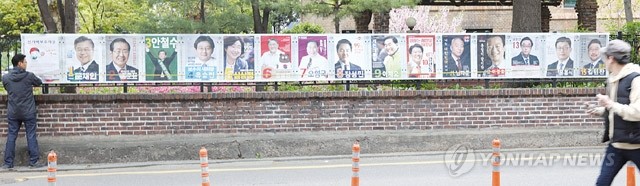 20일 오전 종로구 동숭동에서 서울시선관위 관계자들이 선거벽보의 길이를 재고 있다. 선거벽보는 오는 22일까지 유권자의 통행이 잦은 건물이나 외벽 등 전국 8만7600여곳에 설치된다.