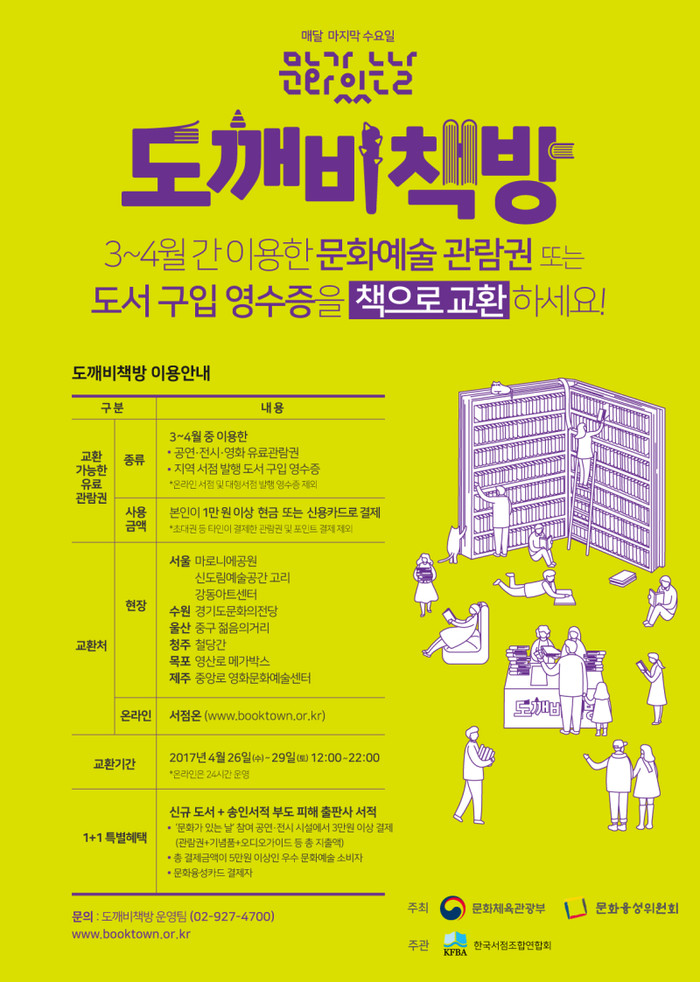 우선 ‘세계 책의 날’을 맞아 오는 26~29일 낮 12시~오후 10시 열리는 ‘도깨비책방’은 지난 3월과 이달 중 공연·전시·영화 관람권과 지역서점에서 구매한 도서 영수증을 새책으로 교환하는 프로그램으로, 한국 국적의 작가가 최근 5년 이내 창작했거나 집필한 저서 100종을 선정해 2만부의 도서에서 교환해 준다.