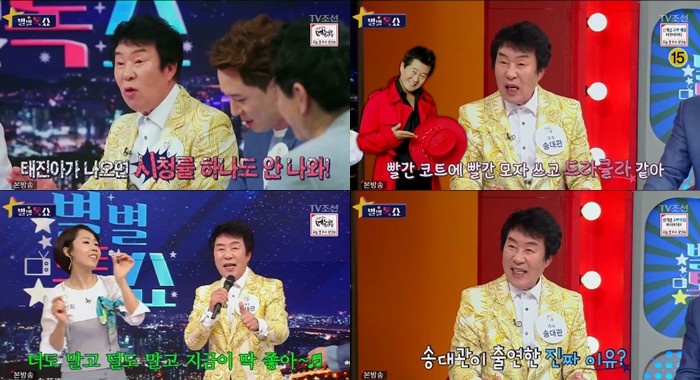 이날 송대관은 태진아가 나오면 시청률이 저조하지만 자신이 나오면 시청률이 꽉 찬다고 말해 웃음을 자아냈다.