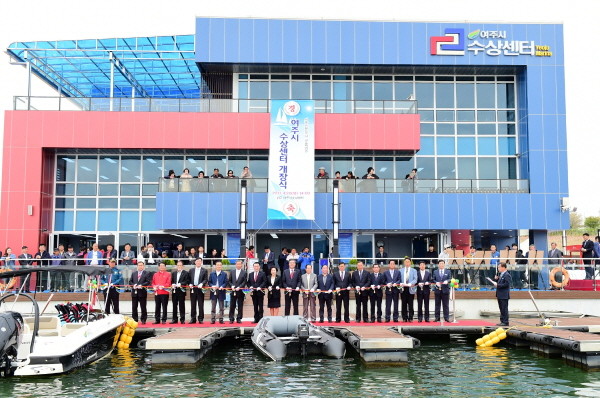 경기 여주시는 지난 20일 현암동 남한강변에 지역주민과 관광객들의 수상레저를 위해 조성한 ‘여주시수상센터’의 개소식을 개최했다. 사진은 원경희 시장(가운데)등 관계자들이 테이프 커팅을 하는 모습.(사진제공=여주시청)
