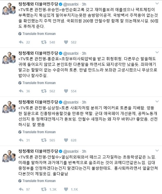 방송을 접한 정청래 전 의원은 토론이 끝난 직후, 자신의 SNS에 관전평을 게재했으며 간결하고 솔직한 글들로 네티즌들의 호응을 얻고 있다.